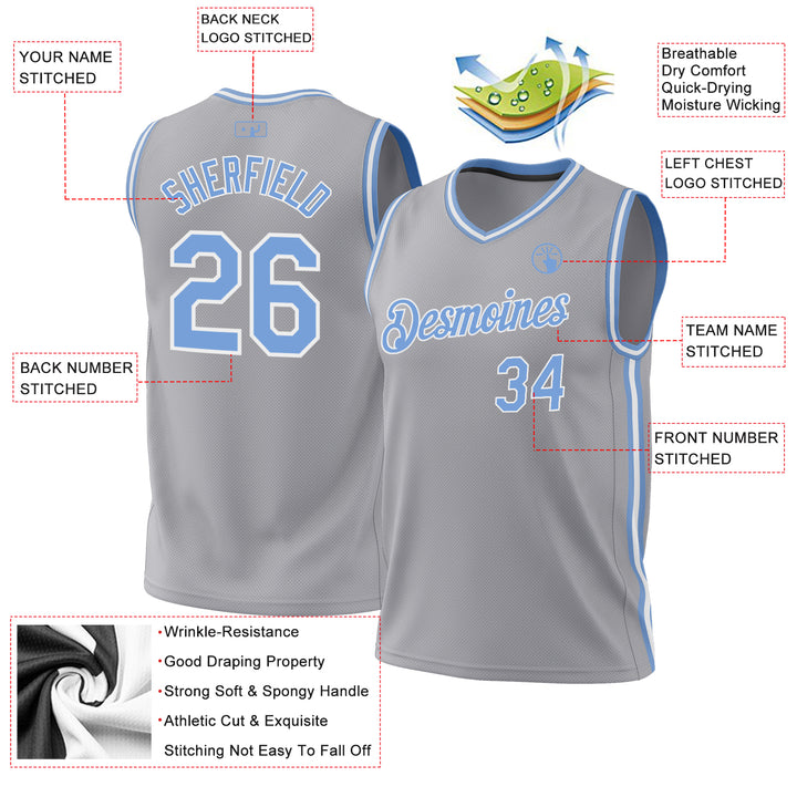Custom Gray Light Blue-White Authentic Throwback Basketball Jersey
