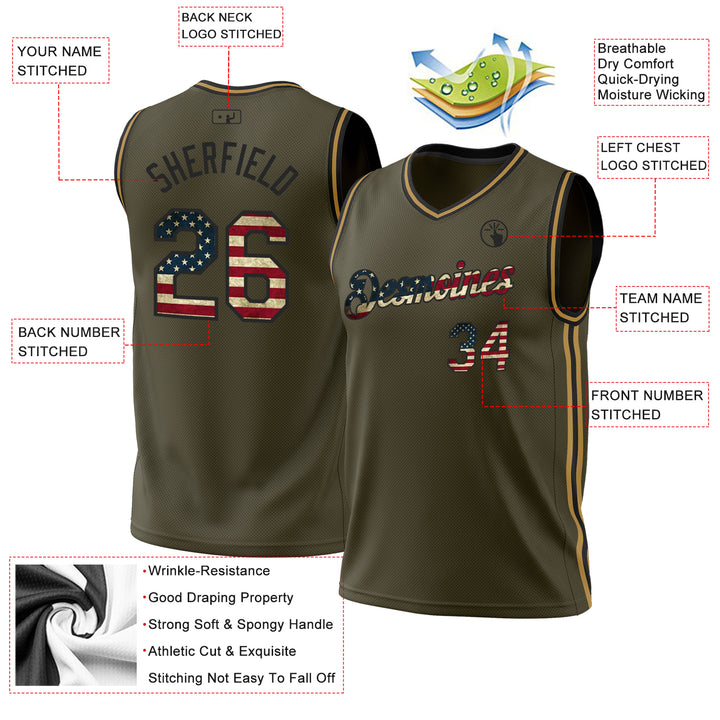 Custom Olive Vintage USA Flag Black-Old Gold Authentic Throwback Salute To Service Basketball Jersey