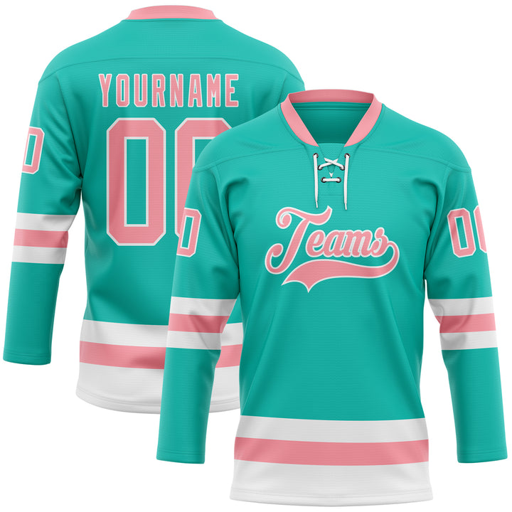 Custom Aqua Medium Pink-White Hockey Lace Neck Jersey