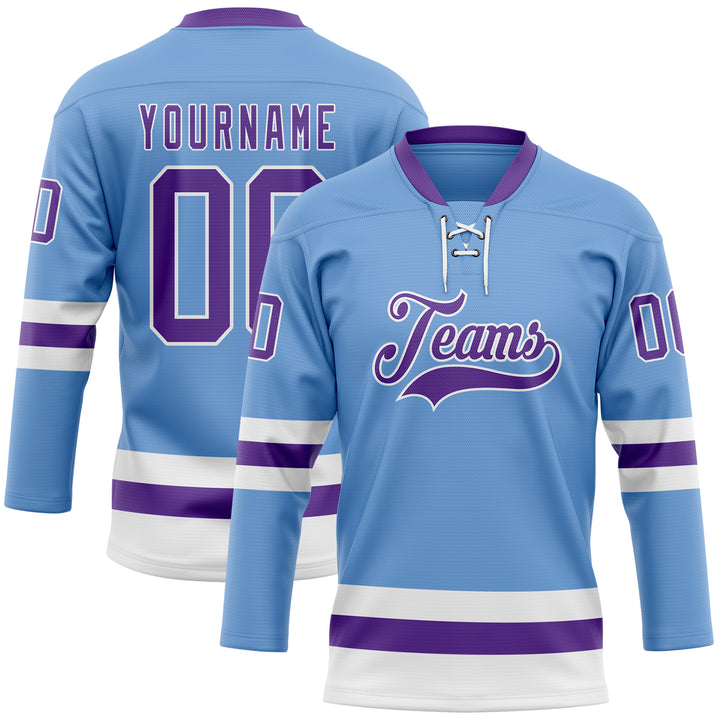 Custom Light Blue Purple-White Hockey Lace Neck Jersey