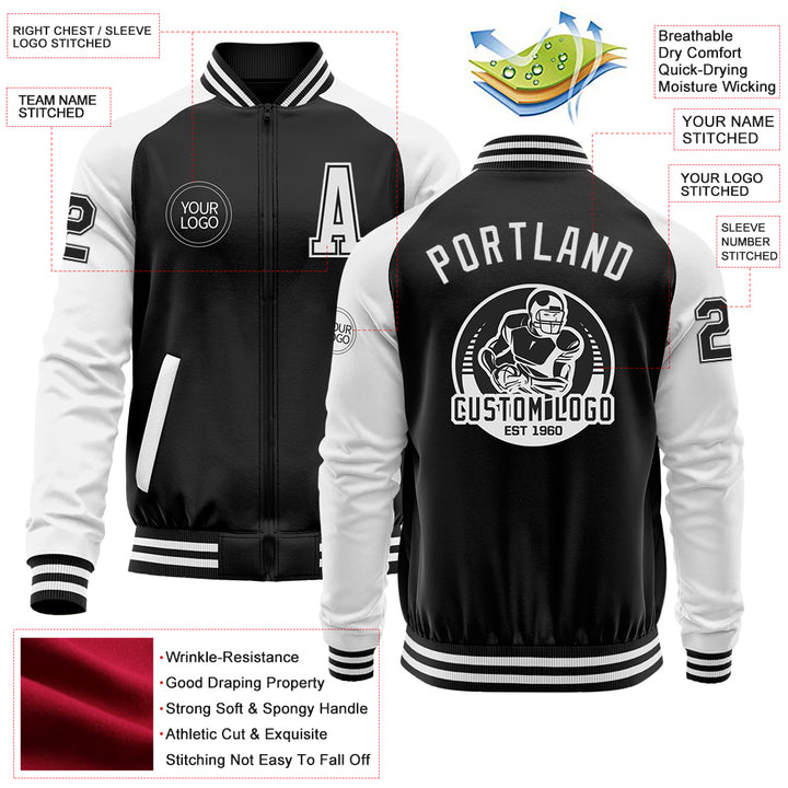 Custom Black White Bomber Varsity Letterman Two Tone Zipper Jacket