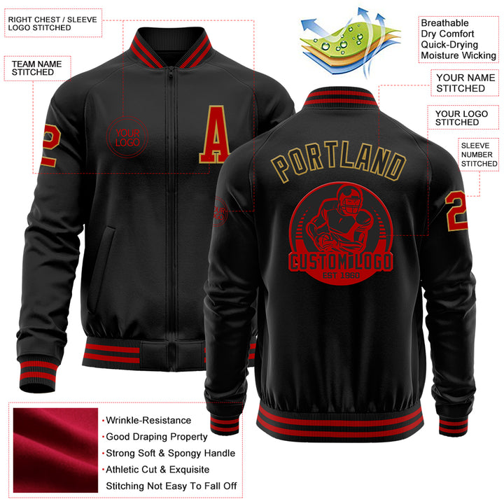 Custom Black Red-Old Gold Bomber Varsity Letterman Zipper Jacket