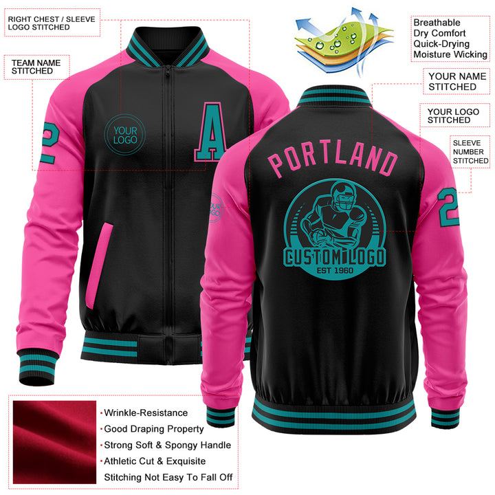 Custom Black Teal-Pink Bomber Varsity Letterman Two Tone Zipper Jacket