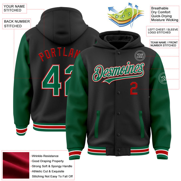 Custom Black Kelly Green-Red Bomber Full-Snap Varsity Letterman Two Tone Hoodie Jacket