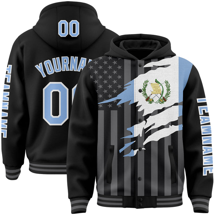 Custom Black Light Blue-Gray Guatemala Guatemalan Flag 3D Bomber Full-Snap Varsity Letterman Hoodie Jacket