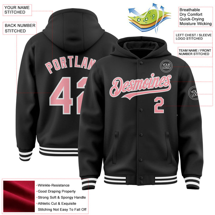 Custom Black Medium Pink-White Bomber Full-Snap Varsity Letterman Hoodie Jacket