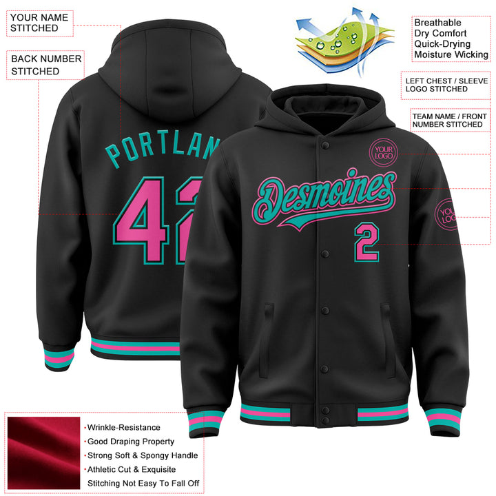 Custom Black Pink-Aqua Bomber Full-Snap Varsity Letterman Hoodie Jacket