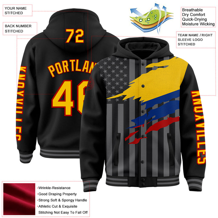 Custom Black Yellow Red-Gray Colombia Colombian Flag 3D Bomber Full-Snap Varsity Letterman Hoodie Jacket