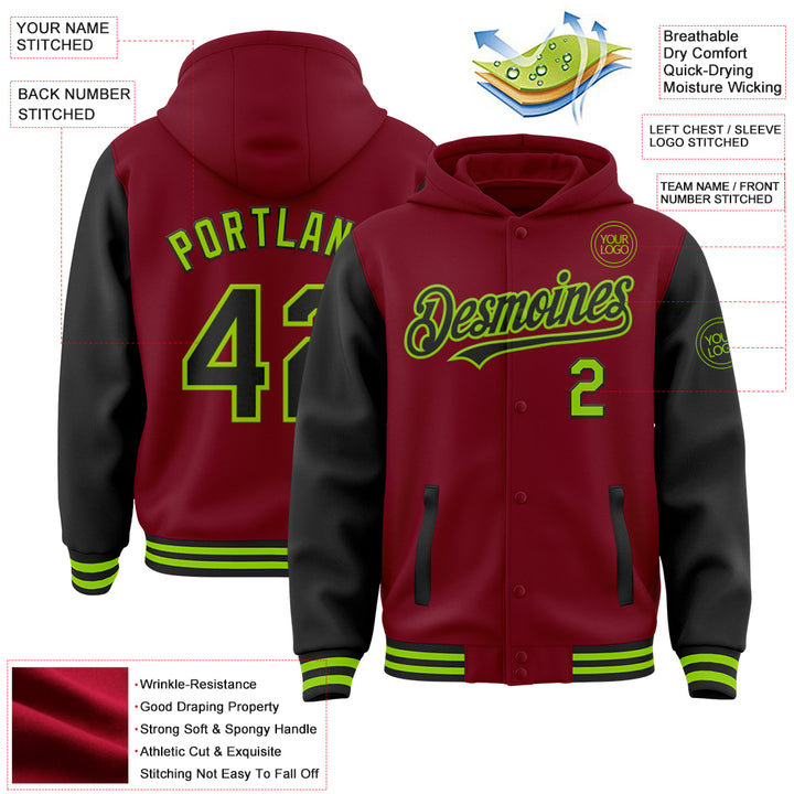 Custom Crimson Black-Neon Green Bomber Full-Snap Varsity Letterman Two Tone Hoodie Jacket