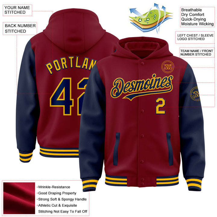 Custom Crimson Navy-Gold Bomber Full-Snap Varsity Letterman Two Tone Hoodie Jacket