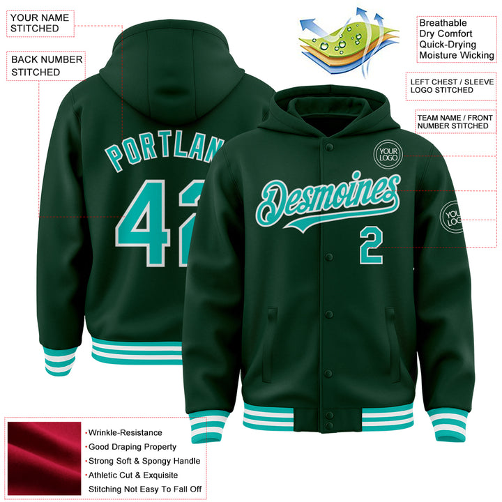 Custom Green Aqua-White Bomber Full-Snap Varsity Letterman Hoodie Jacket