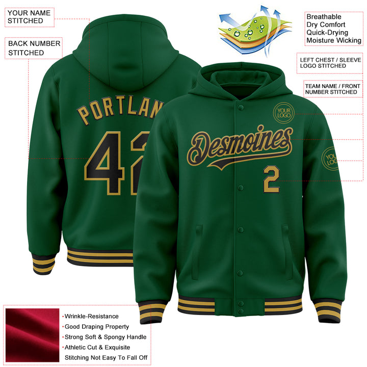 Custom Kelly Green Black-Old Gold Bomber Full-Snap Varsity Letterman Hoodie Jacket