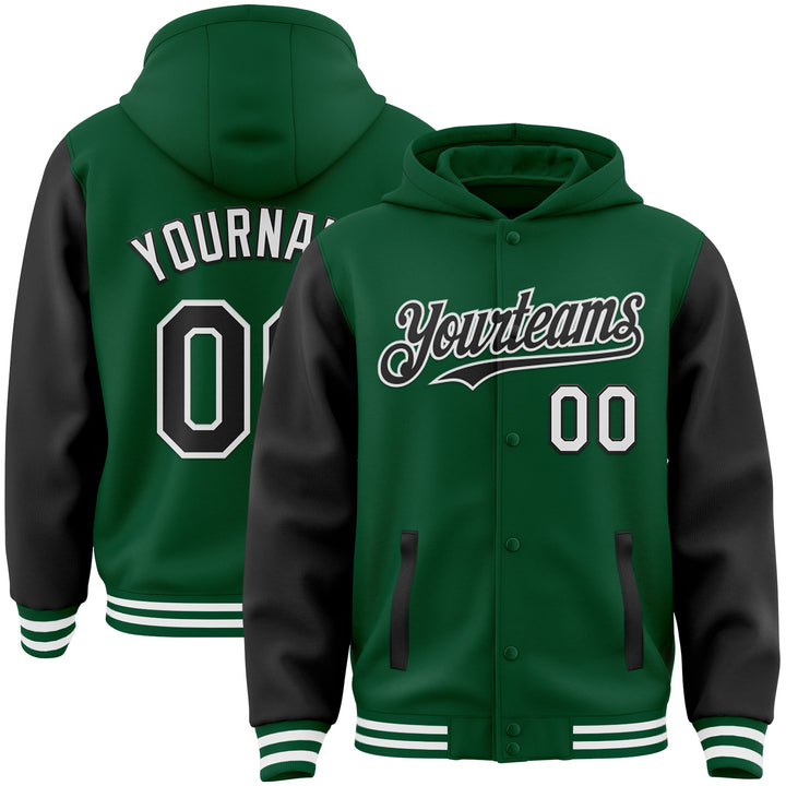 Custom Kelly Green Black-White Bomber Full-Snap Varsity Letterman Two Tone Hoodie Jacket