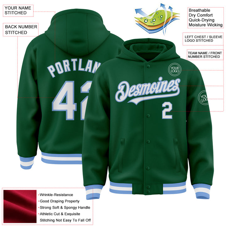 Custom Kelly Green White-Light Blue Bomber Full-Snap Varsity Letterman Hoodie Jacket