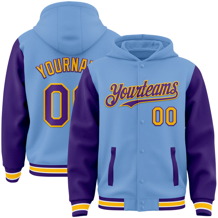 Custom Light Blue Purple-Gold Bomber Full-Snap Varsity Letterman Two Tone Hoodie Jacket