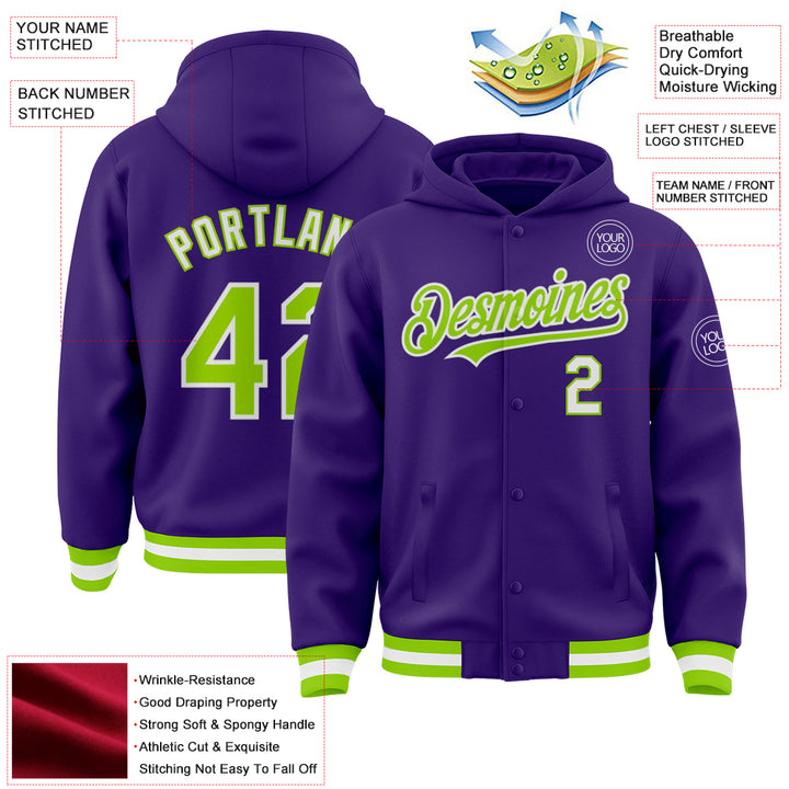Custom Purple Neon Green-White Bomber Full-Snap Varsity Letterman Hoodie Jacket