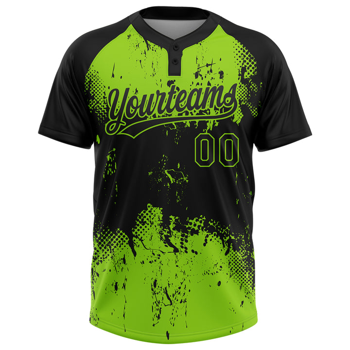 Custom Black Neon Green 3D Pattern Abstract Splatter Grunge Art Two-Button Unisex Softball Jersey