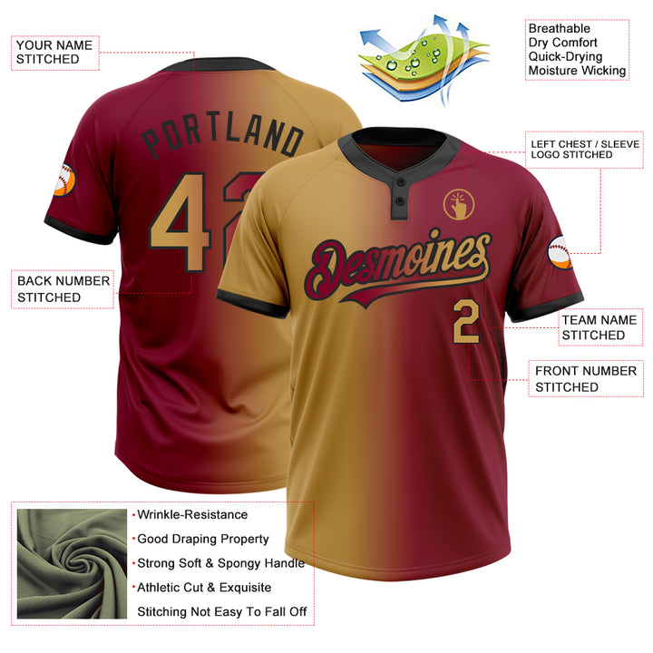 Custom Maroon Old Gold-Black Gradient Fashion Two-Button Unisex Softball Jersey