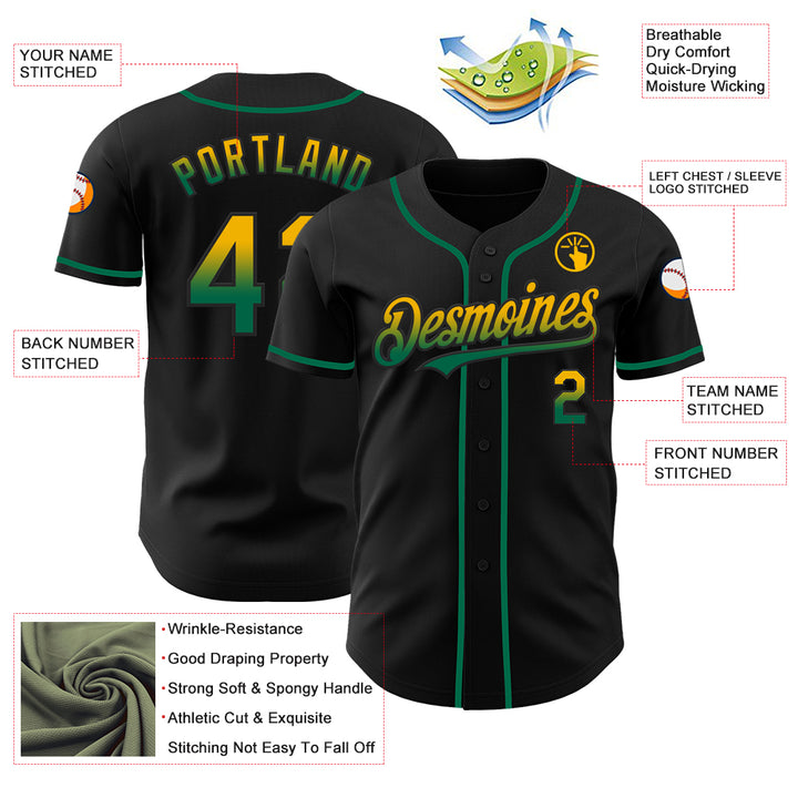 Custom Black Gold-Kelly Green Authentic Fade Fashion Baseball Jersey