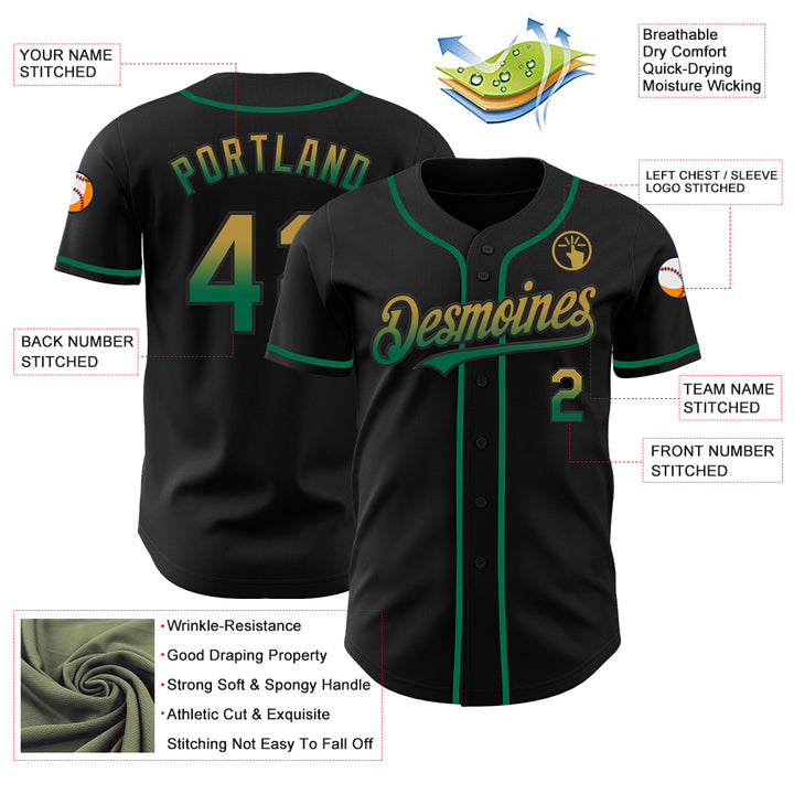 Custom Black Old Gold-Kelly Green Authentic Fade Fashion Baseball Jersey
