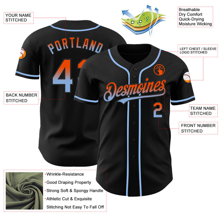 Custom Black Orange-Light Blue Authentic Fade Fashion Baseball Jersey
