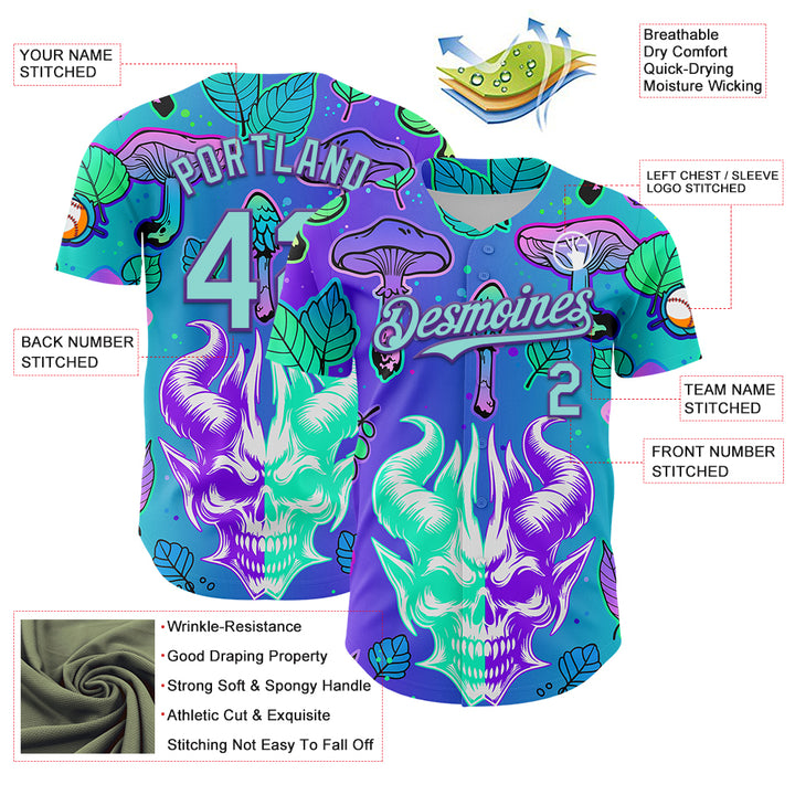 Custom Blue Ice Blue-Purple 3D Pattern Design Trippy Magic Mushrooms Demon Skull Authentic Baseball Jersey