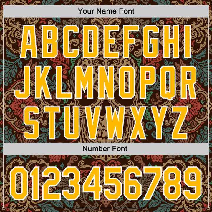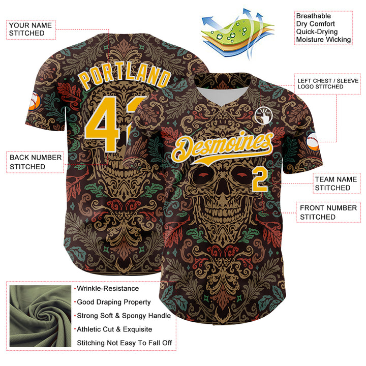 Custom Brown Gold-White 3D Pattern Design Burner Costumes Skull Floral Authentic Baseball Jersey
