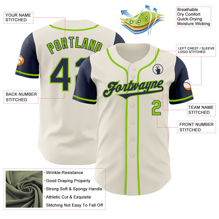 Custom Cream Navy-Neon Green Authentic Two Tone Baseball Jersey