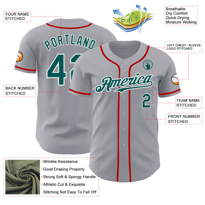 Custom Gray Midnight Green White-Red Authentic Baseball Jersey