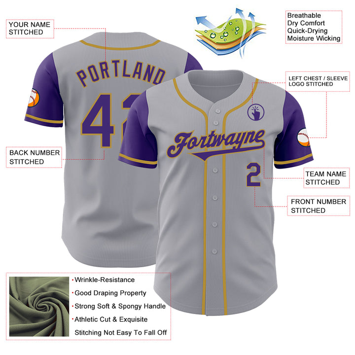 Custom Gray Purple-Old Gold Authentic Two Tone Baseball Jersey