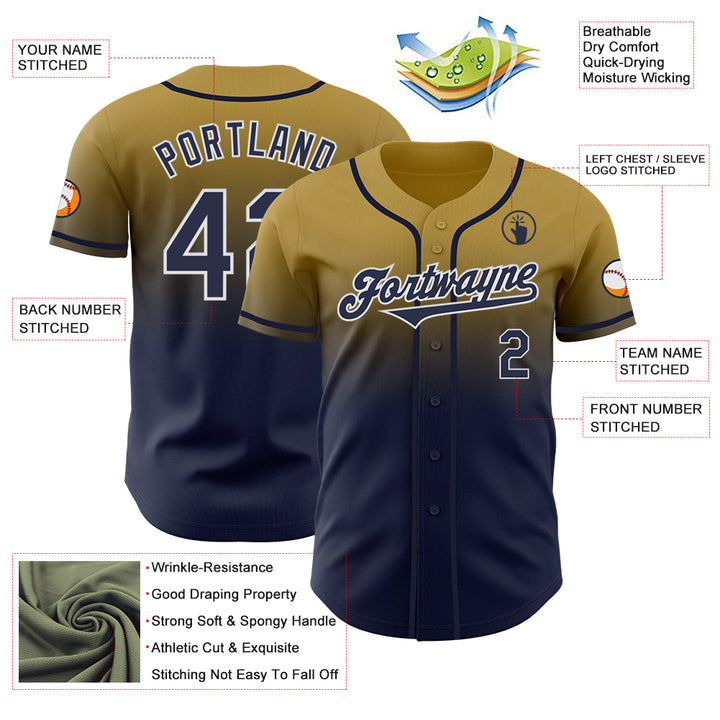 Custom Old Gold Navy-White Authentic Fade Fashion Baseball Jersey
