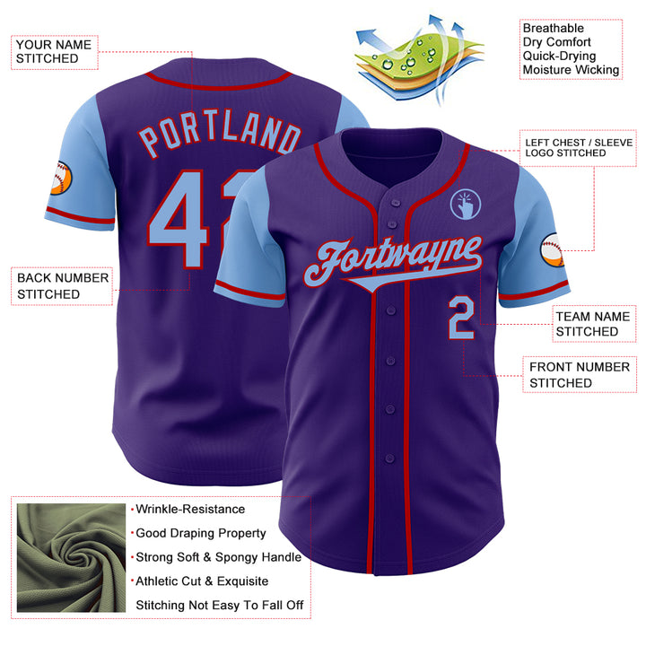 Custom Purple Light Blue-Red Authentic Two Tone Baseball Jersey