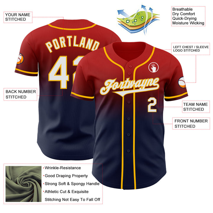 Custom Red Navy-Gold Authentic Fade Fashion Baseball Jersey