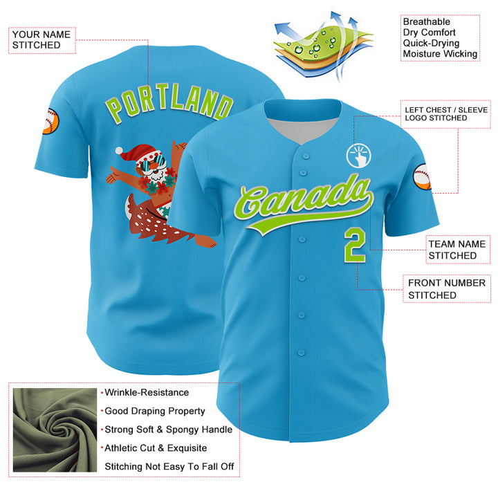 Custom Sky Blue Neon Green-White 3D Funny Christmas Authentic Baseball Jersey