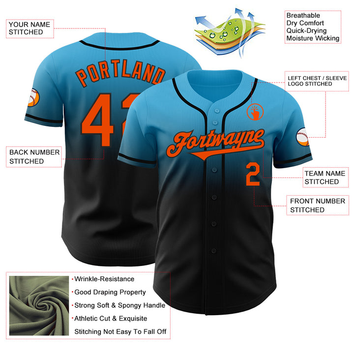 Custom Sky Blue Orange-Black Authentic Fade Fashion Baseball Jersey