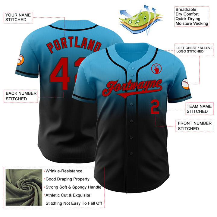 Custom Sky Blue Red-Black Authentic Fade Fashion Baseball Jersey