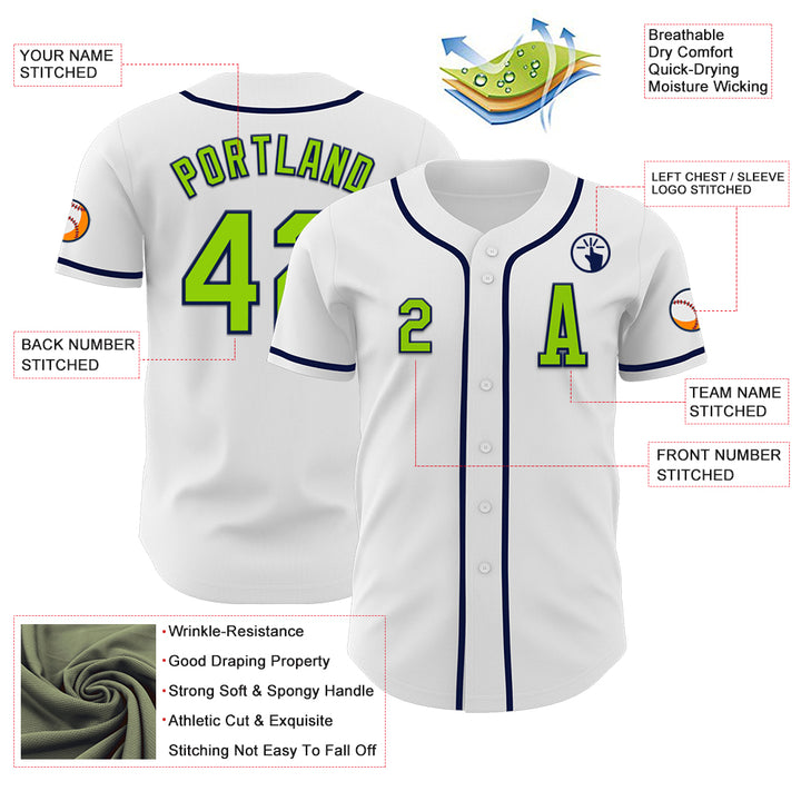 Custom White Neon Green-Navy Authentic Baseball Jersey
