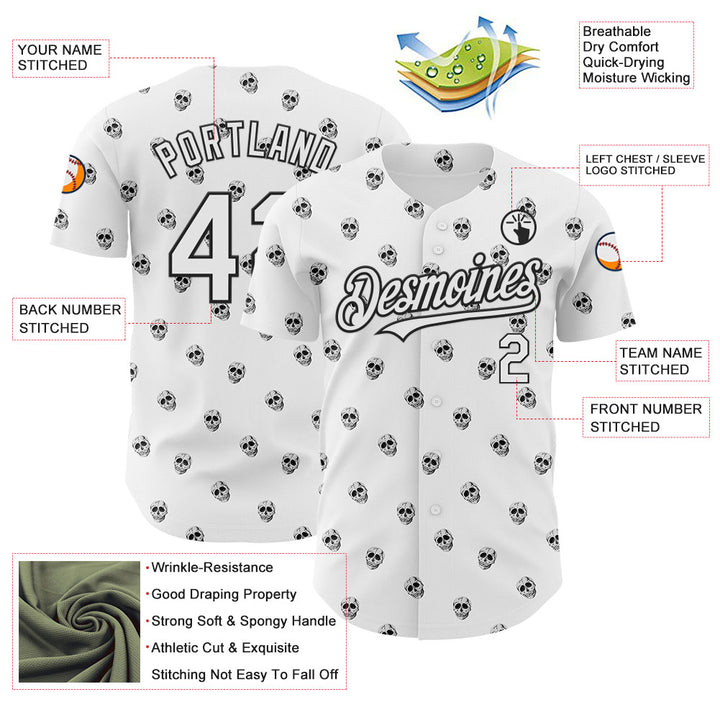 Custom White Black 3D Skull Authentic Baseball Jersey