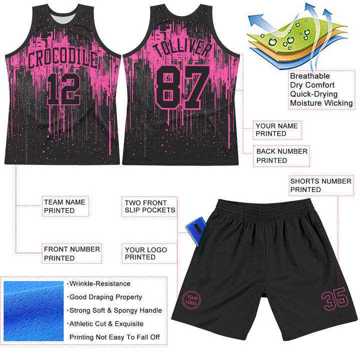 Custom Black Pink Dripping Splatter Art Round Neck Sublimation Basketball Suit Jersey