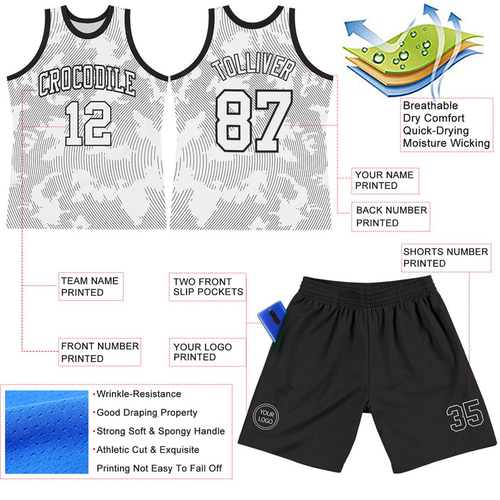 Custom White Black Curve Lines Round Neck Sublimation Basketball Suit Jersey