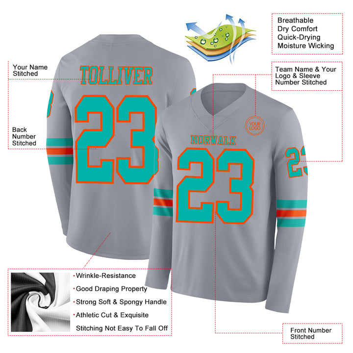 Custom Gray Aqua-Orange Long Sleeve Authentic Football Jersey