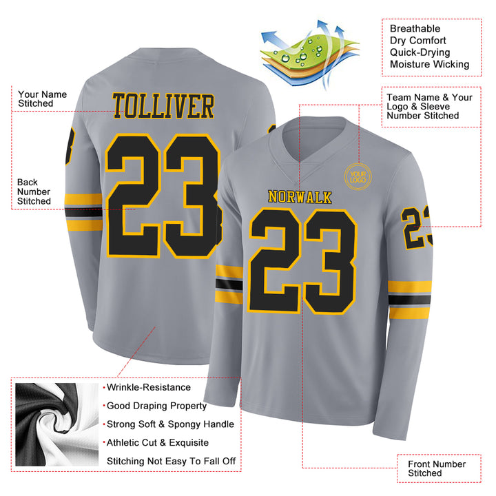 Custom Gray Black-Gold Long Sleeve Authentic Football Jersey