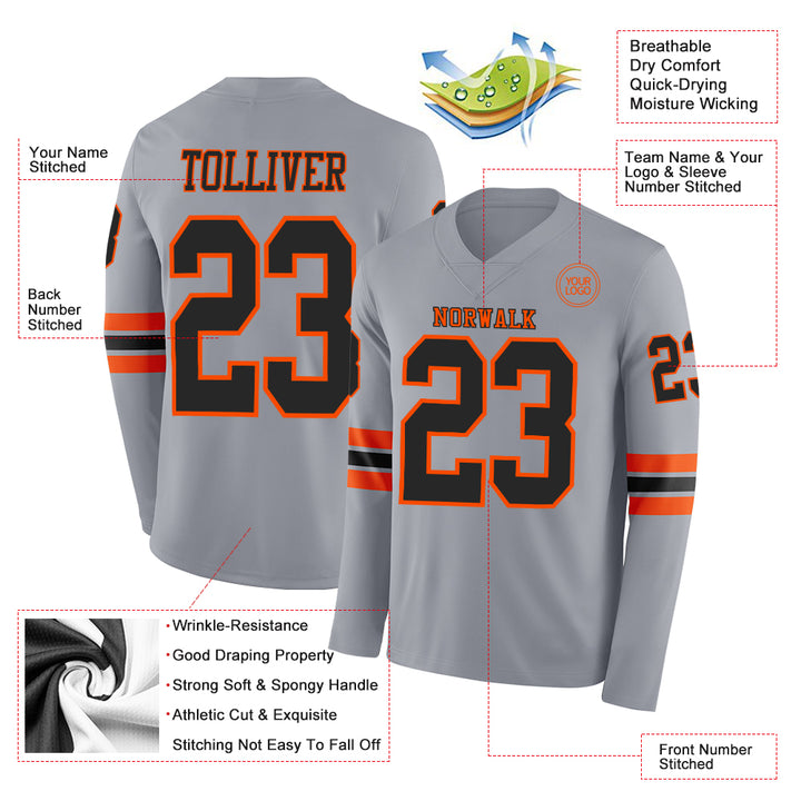 Custom Gray Black-Orange Long Sleeve Authentic Football Jersey
