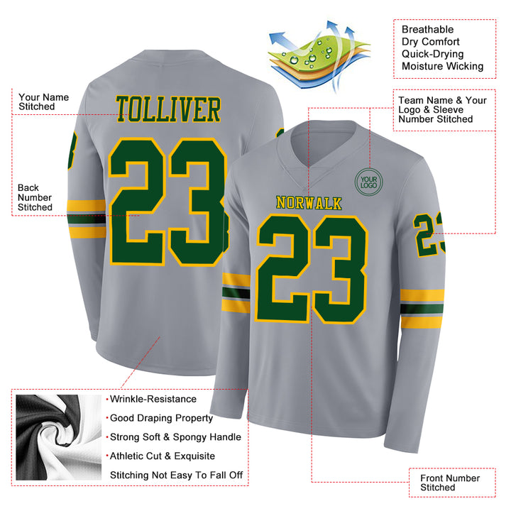 Custom Gray Green-Gold Long Sleeve Authentic Football Jersey