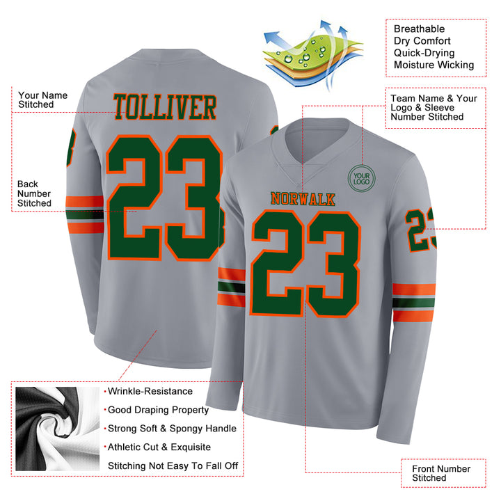Custom Gray Green-Orange Long Sleeve Authentic Football Jersey