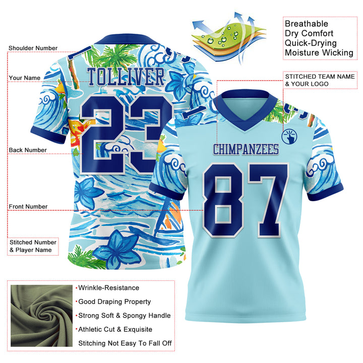 Custom Ice Blue Royal-White 3D Pattern Beach Hawaii Palm Trees And Flowers Authentic Football Jersey