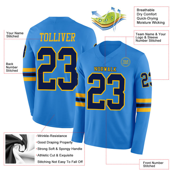 Custom Powder Blue Navy-Gold Long Sleeve Authentic Football Jersey