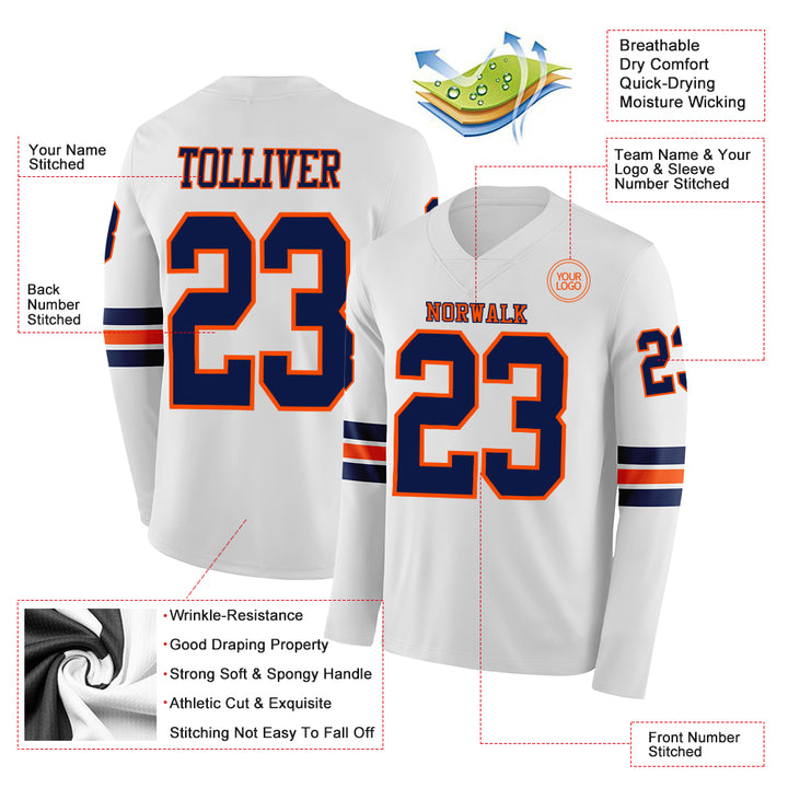 Custom White Navy-Orange Long Sleeve Authentic Football Jersey