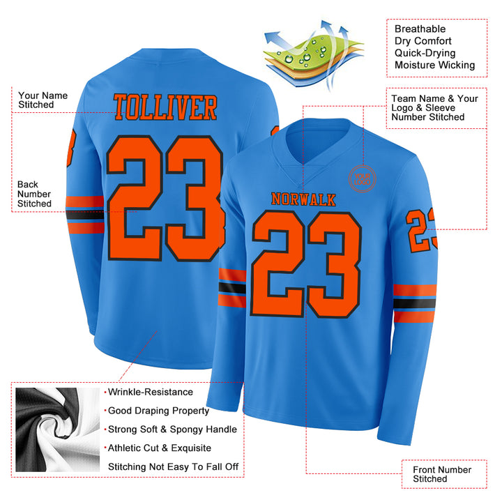Custom Powder Blue Orange-Black Long Sleeve Authentic Football Jersey