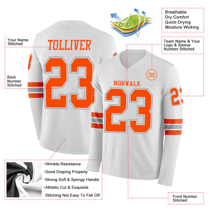Custom White Orange-Gray Long Sleeve Authentic Football Jersey